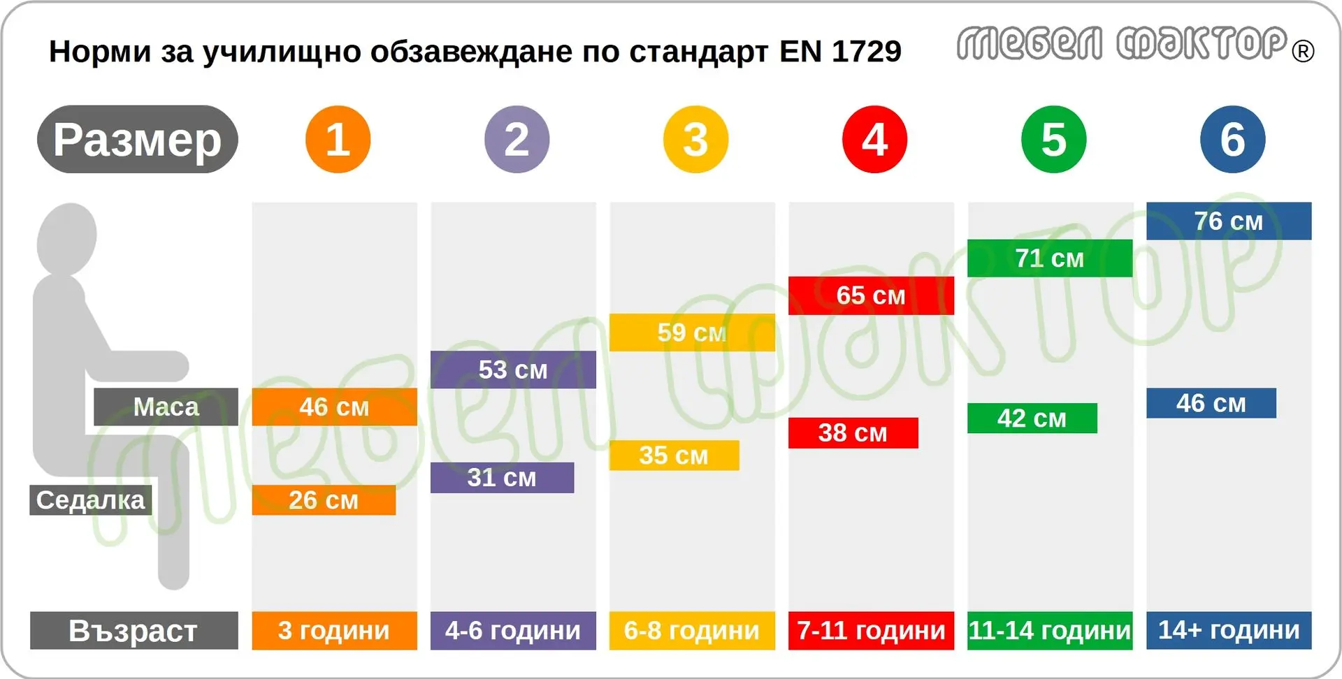 „Мебел Фактор“ предлага безопасни, заоблени ръбове на училищните си маси и подходящи столове, в различни височини спрямо възрастта на детето. Нужните височини са определени в стандарт БДС- EN 1729 и се основават на ергономични изследвания за деца от целия Европейски Съюз. Периодично размерите се обновяват в зависимост от акселерацията при различни поколения.